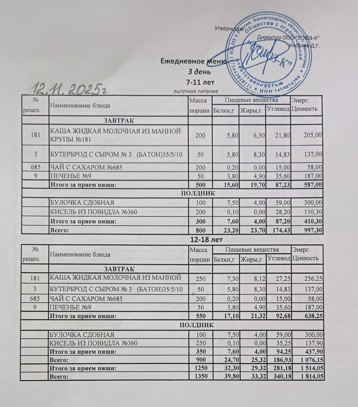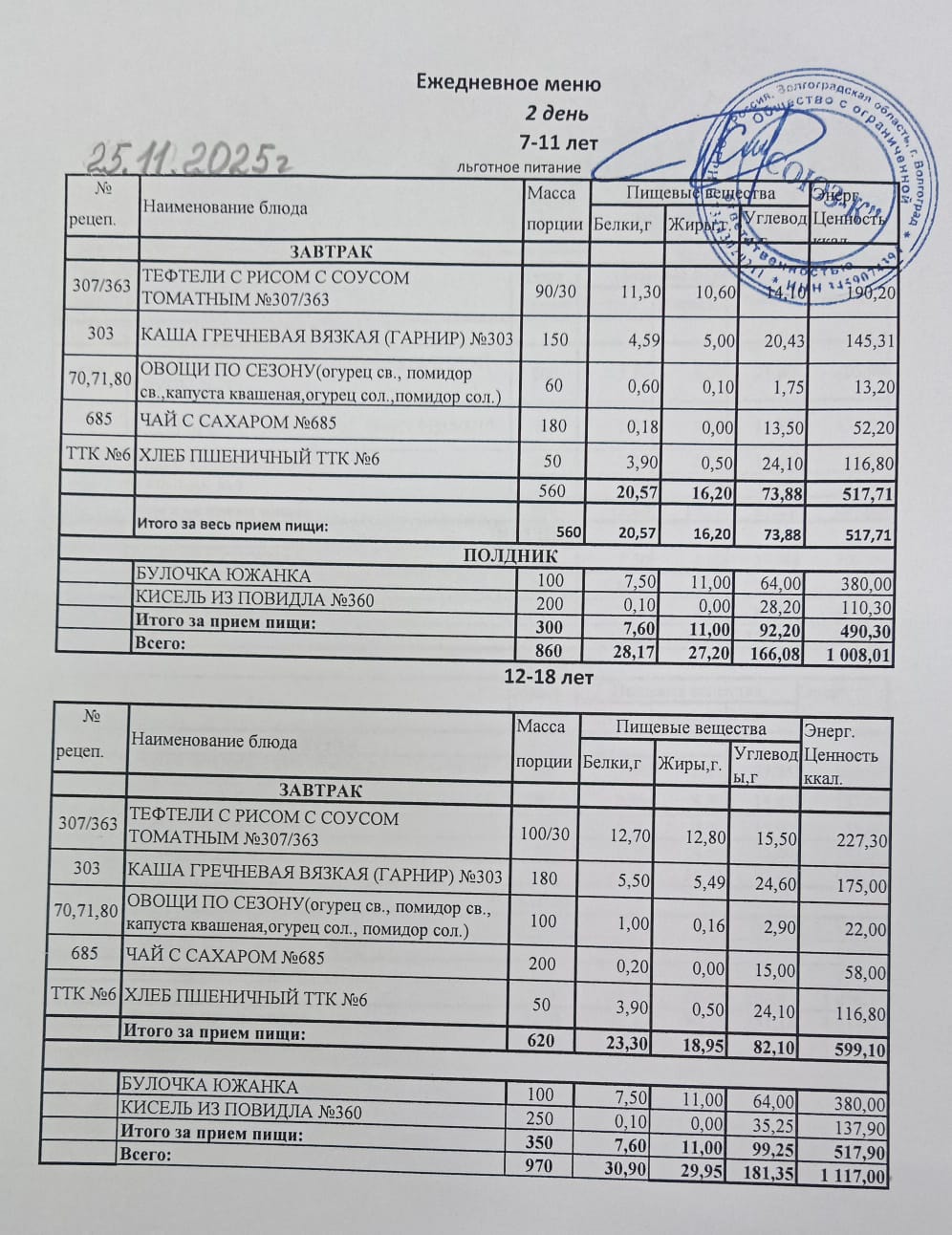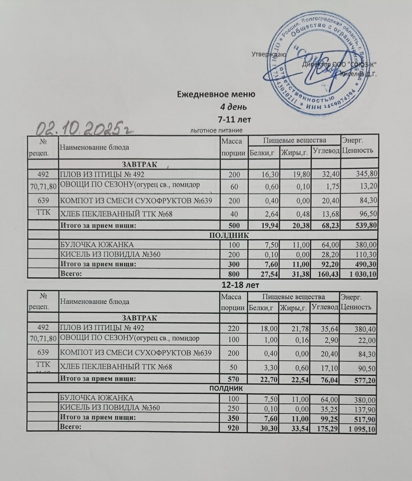 11.12.2025 г. Меню - 4 день - Фото (завтрак) (полдник)