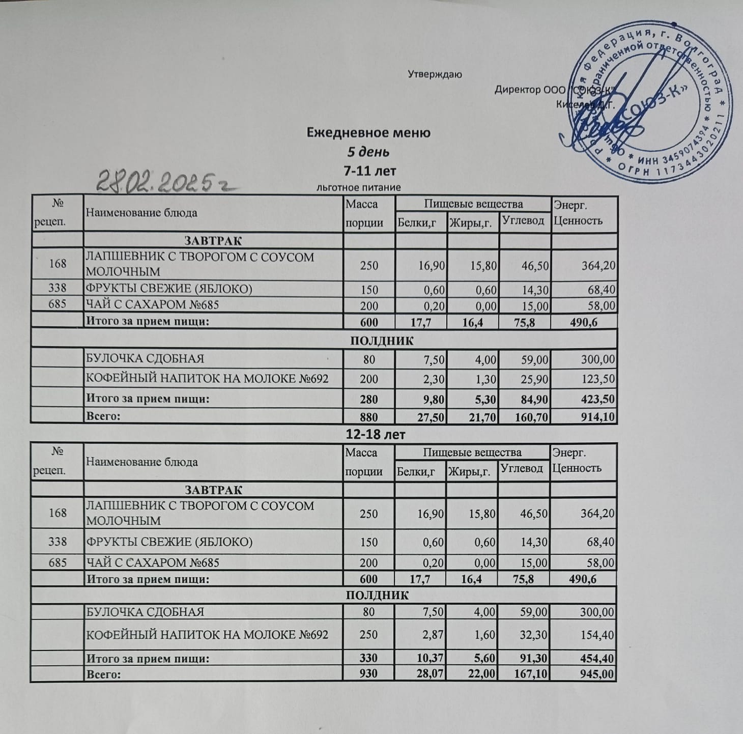 12.12.2025 г. Меню - 5 день - Фото (завтрак) (полдник)
