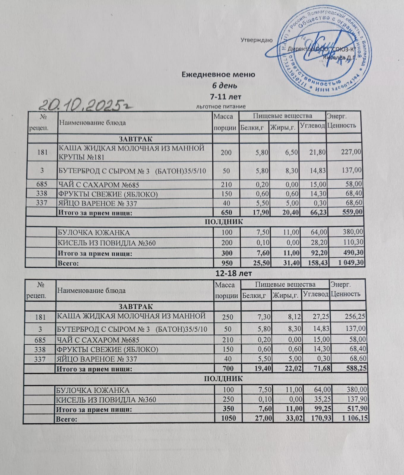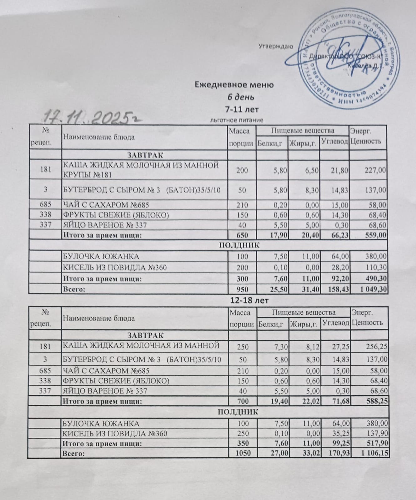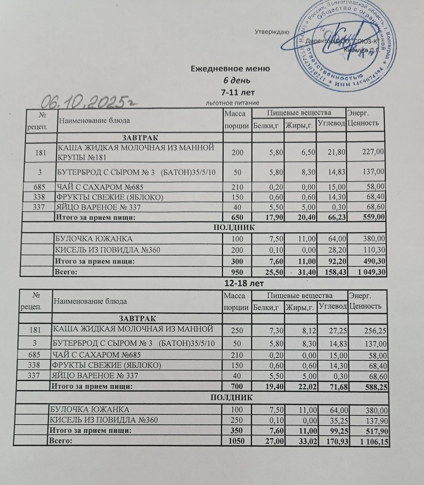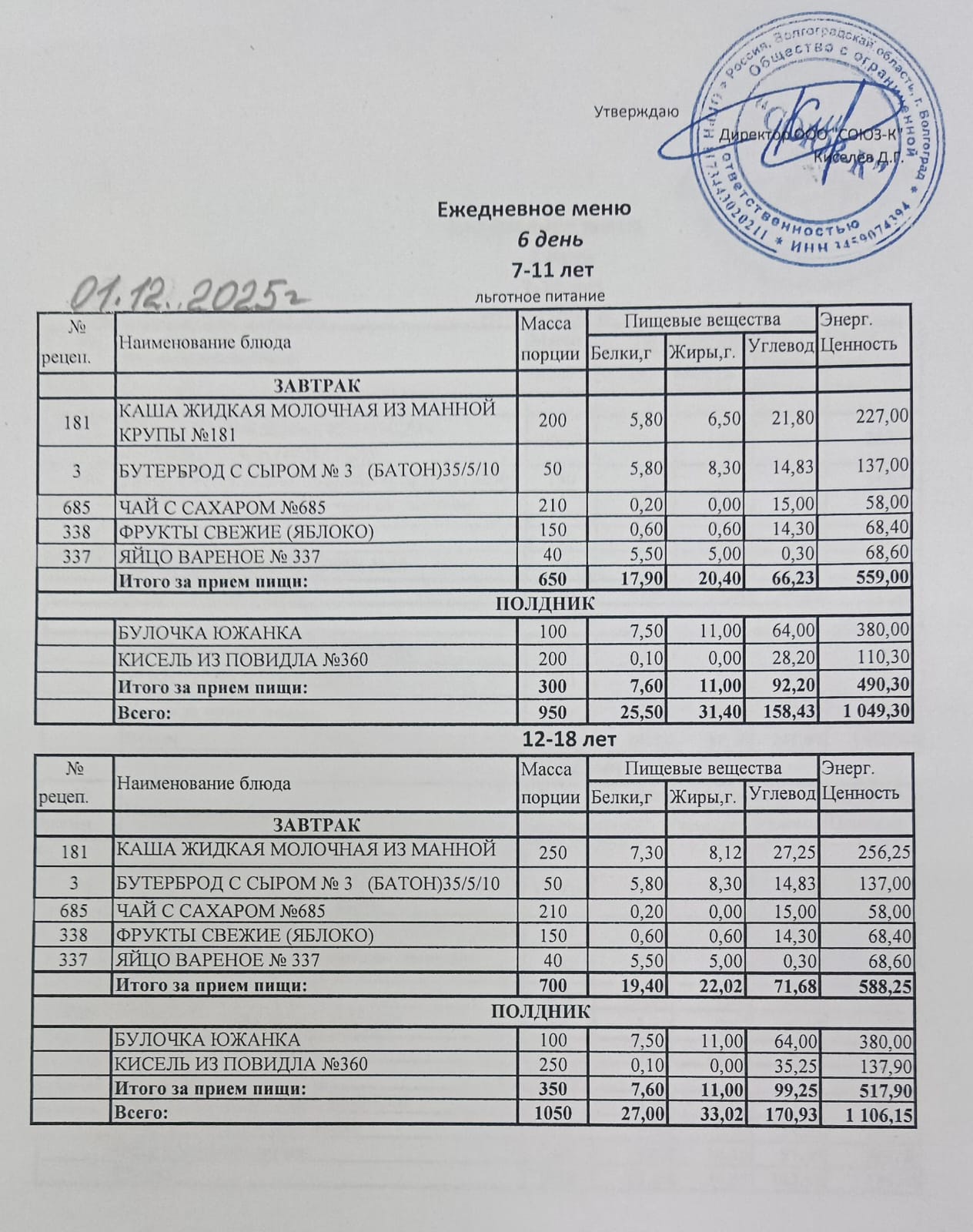 15.12.2025 г. Меню - 6 день - Фото (завтрак) (полдник)