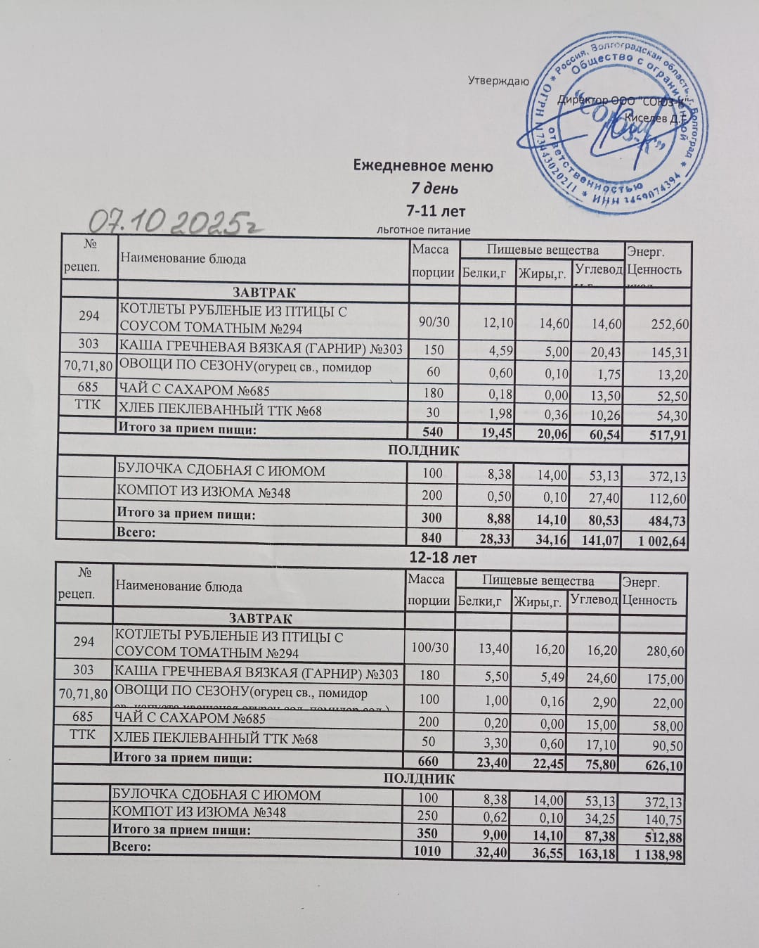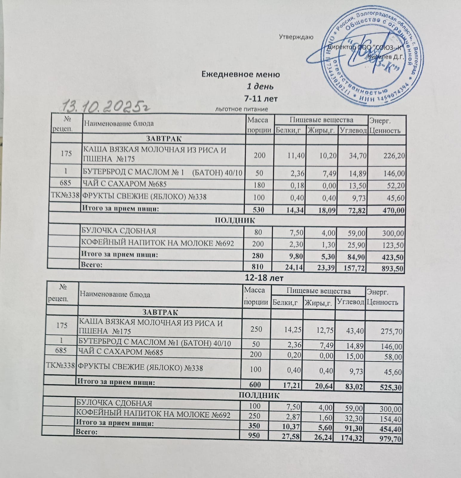 - Примерное десятидневное меню для обеспечения бесплатным горячим питанием обучающихся возрастной группы 7 – 11 лет на 2025-2026 учебный год (смотреть)