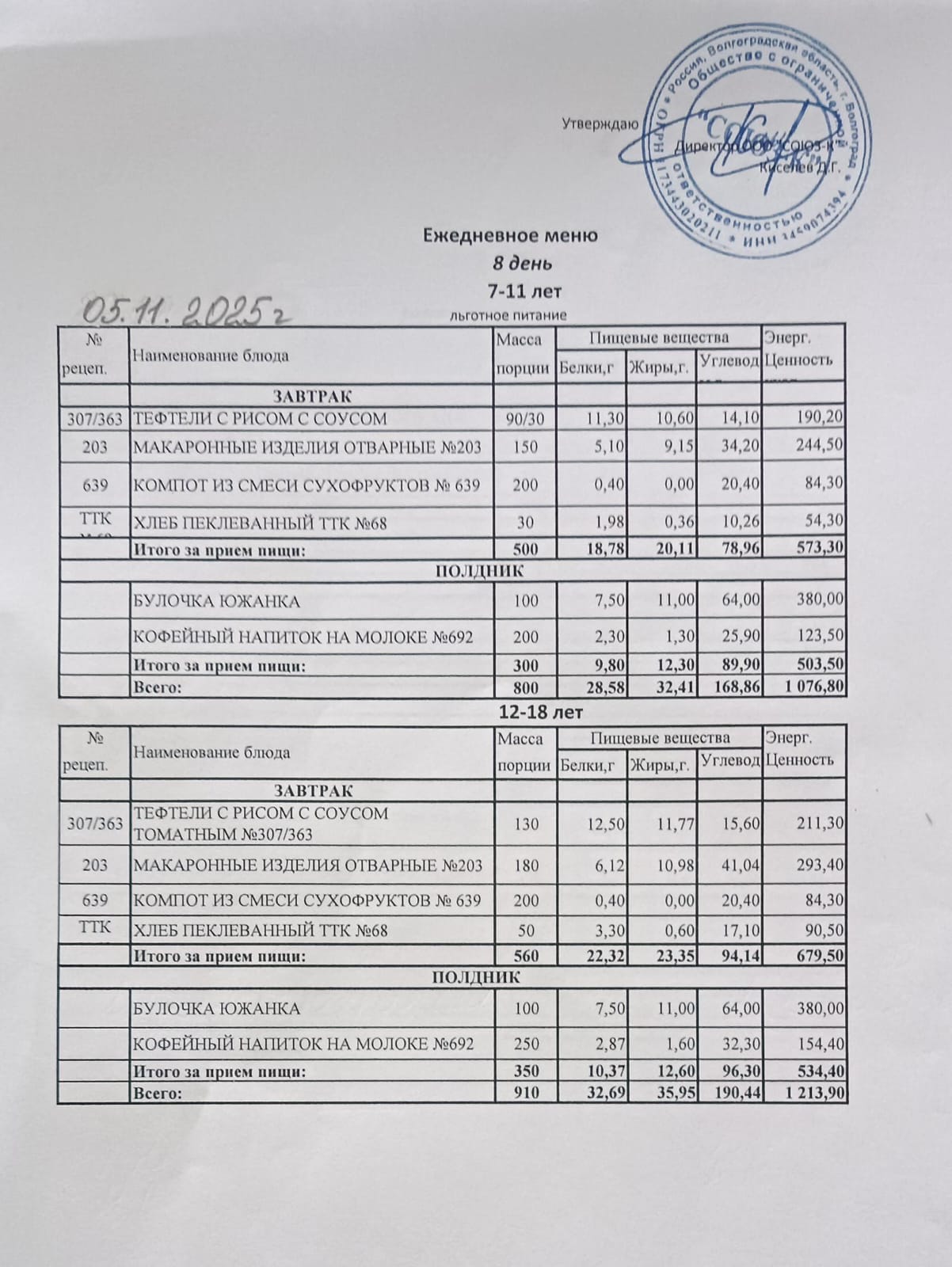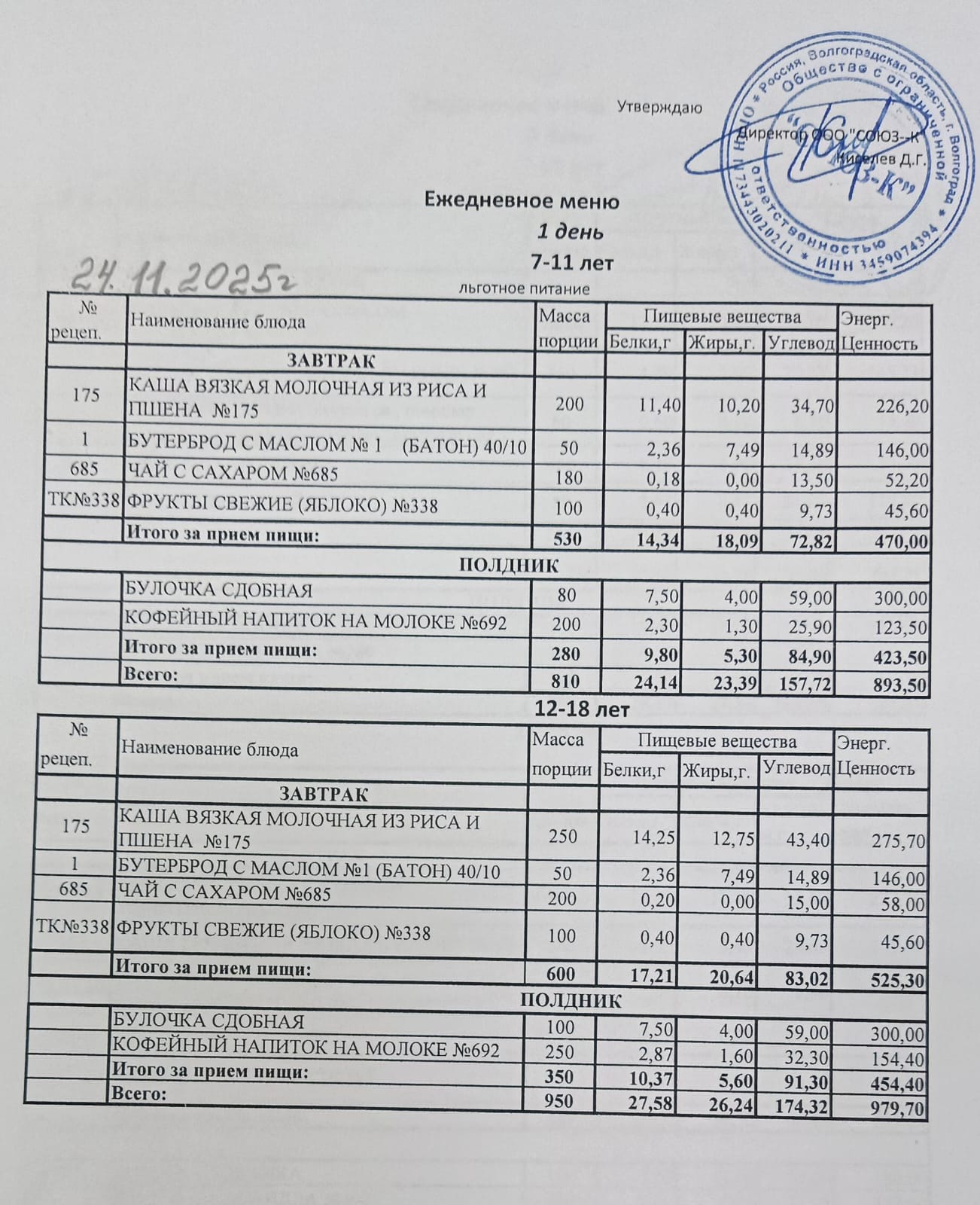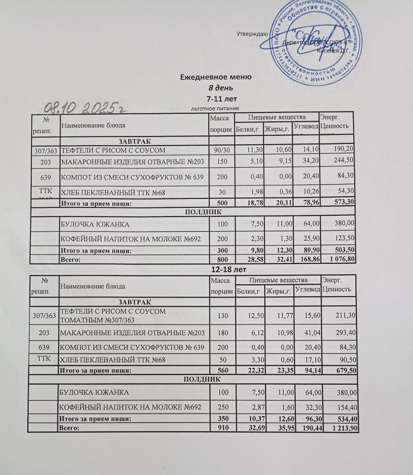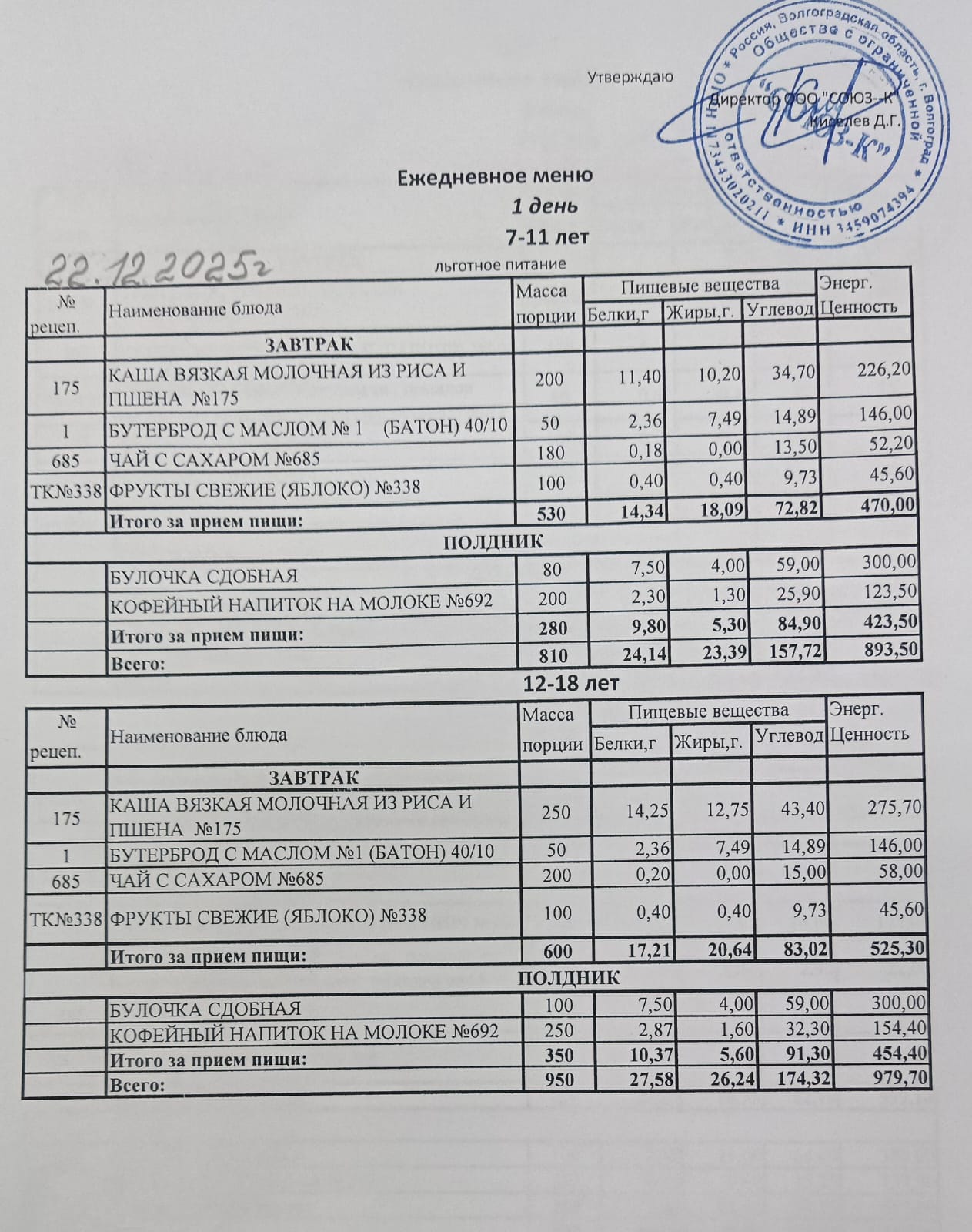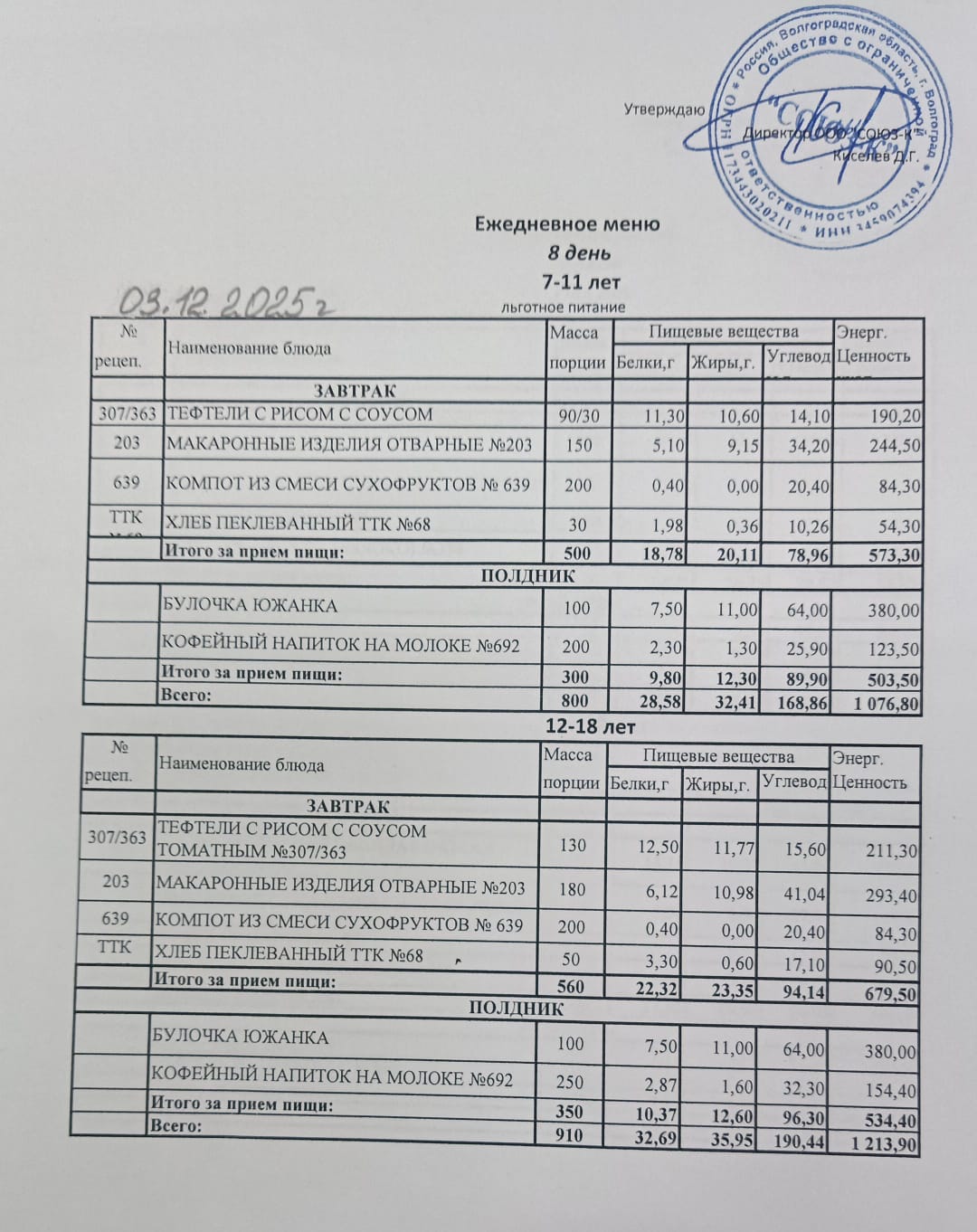 08.12.2025 г. Меню - 1 день - Фото (завтрак) (полдник)