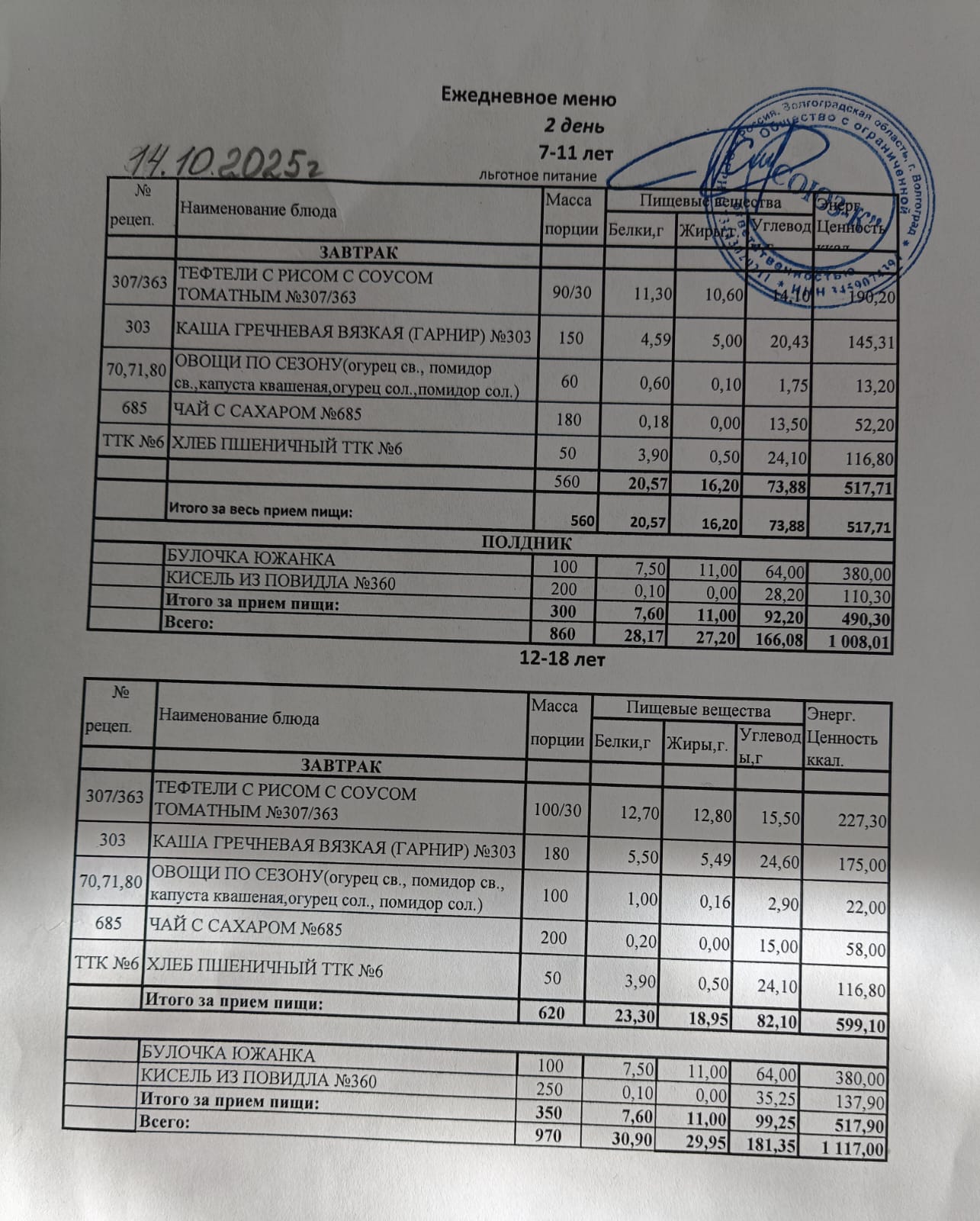 - Еженедельный мониторинг качества питания обучающихся на 14 ноября 2025г.