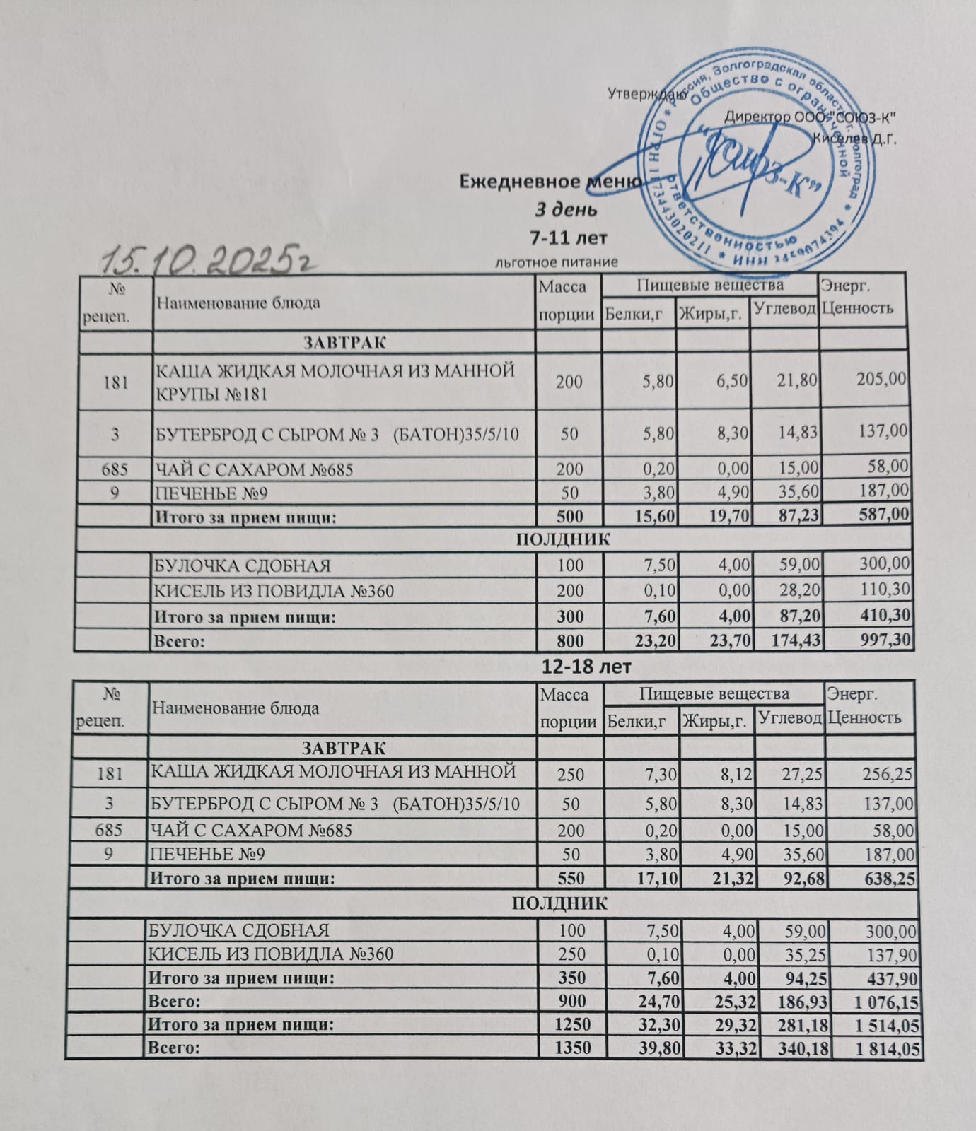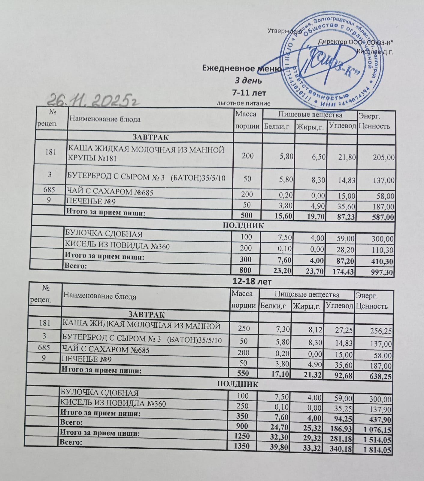 10.12.2025 г. Меню - 3 день - Фото (завтрак) (полдник)