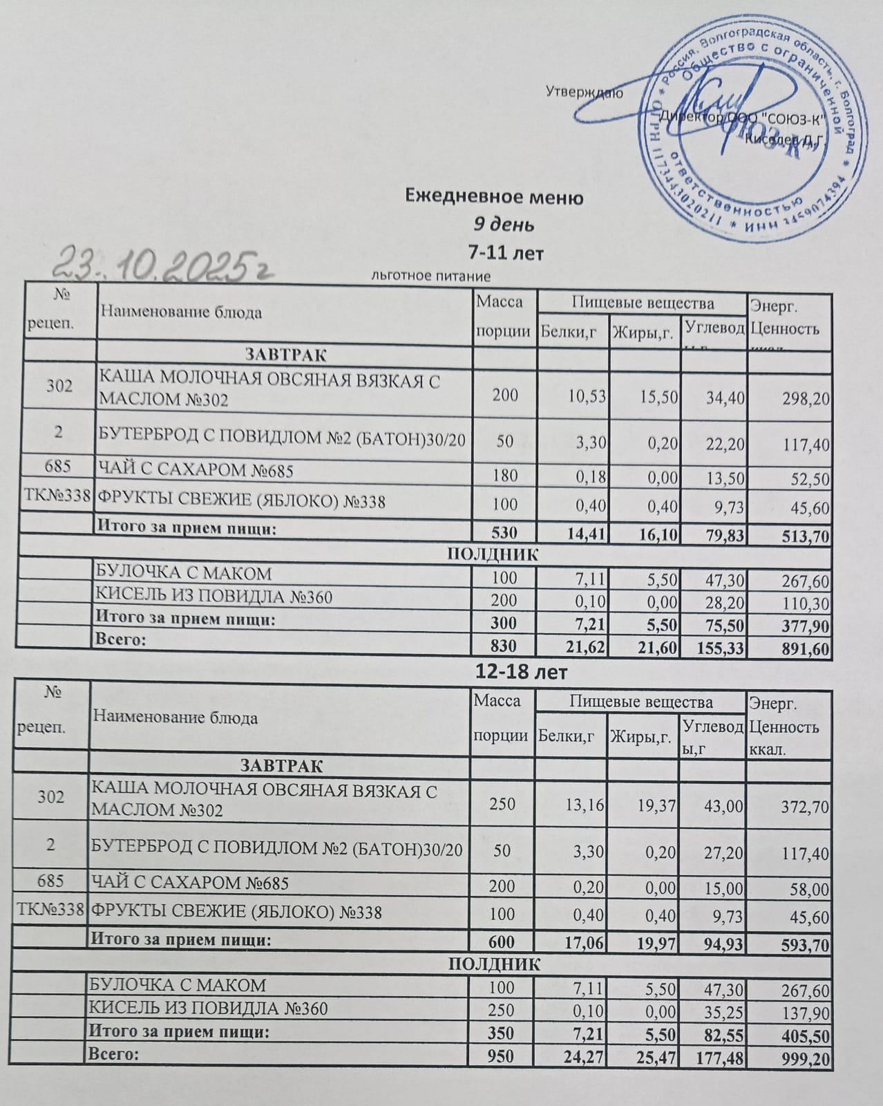 18.12.2025 г. Меню - 9 день - Фото (завтрак) (полдник)