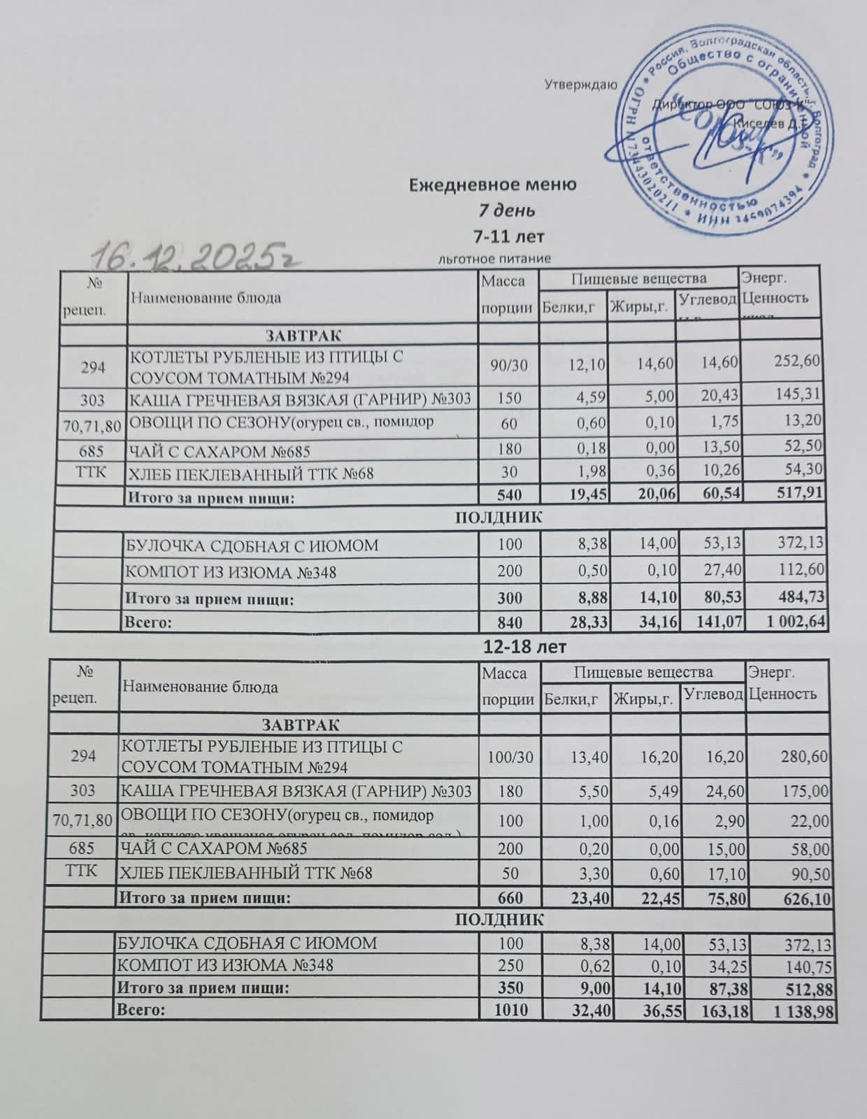 16.12.2025 г. Меню - 7 день - Фото (завтрак) (полдник)
