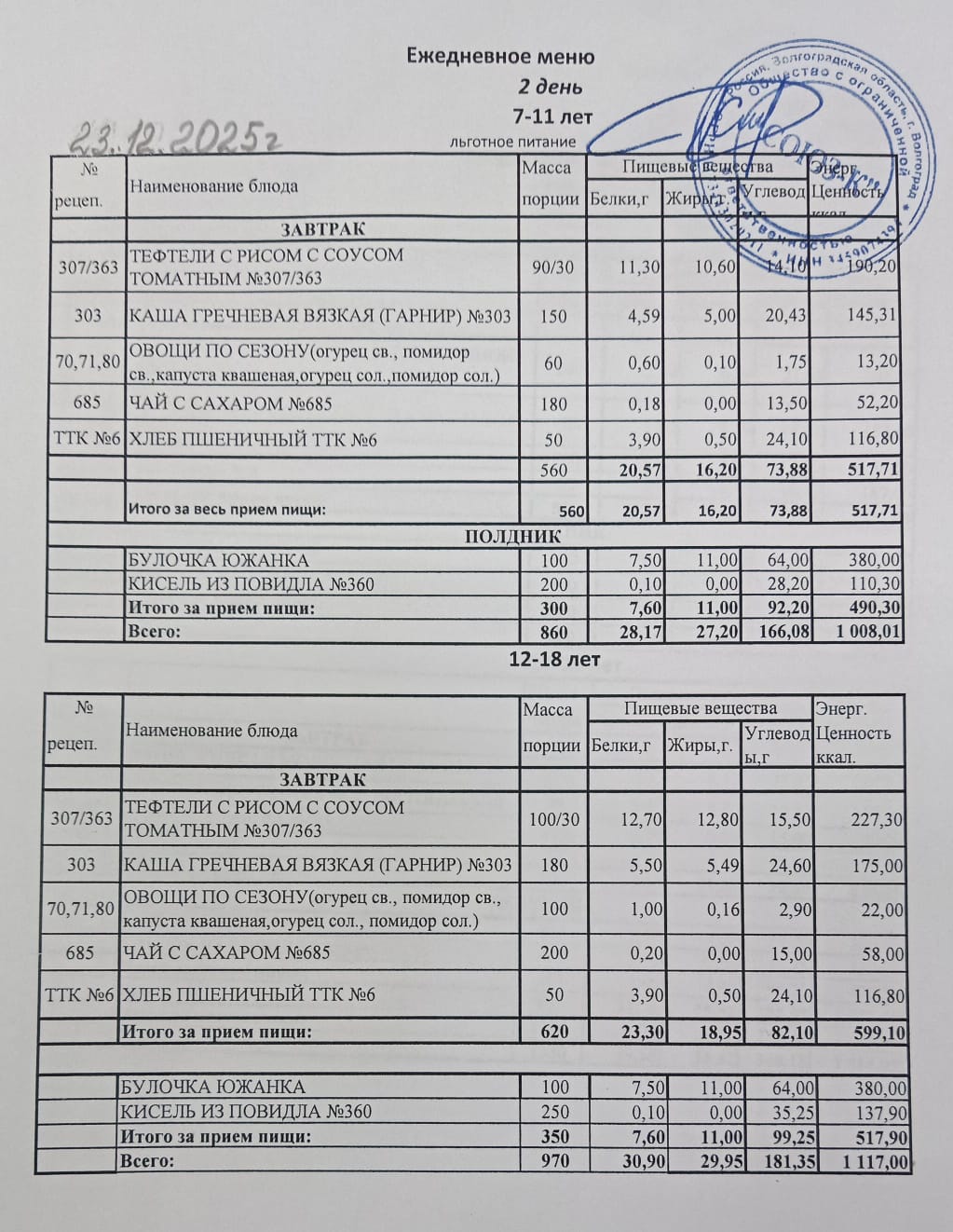23.12.2025 г. Меню - 2 день - Фото (завтрак) (полдник)