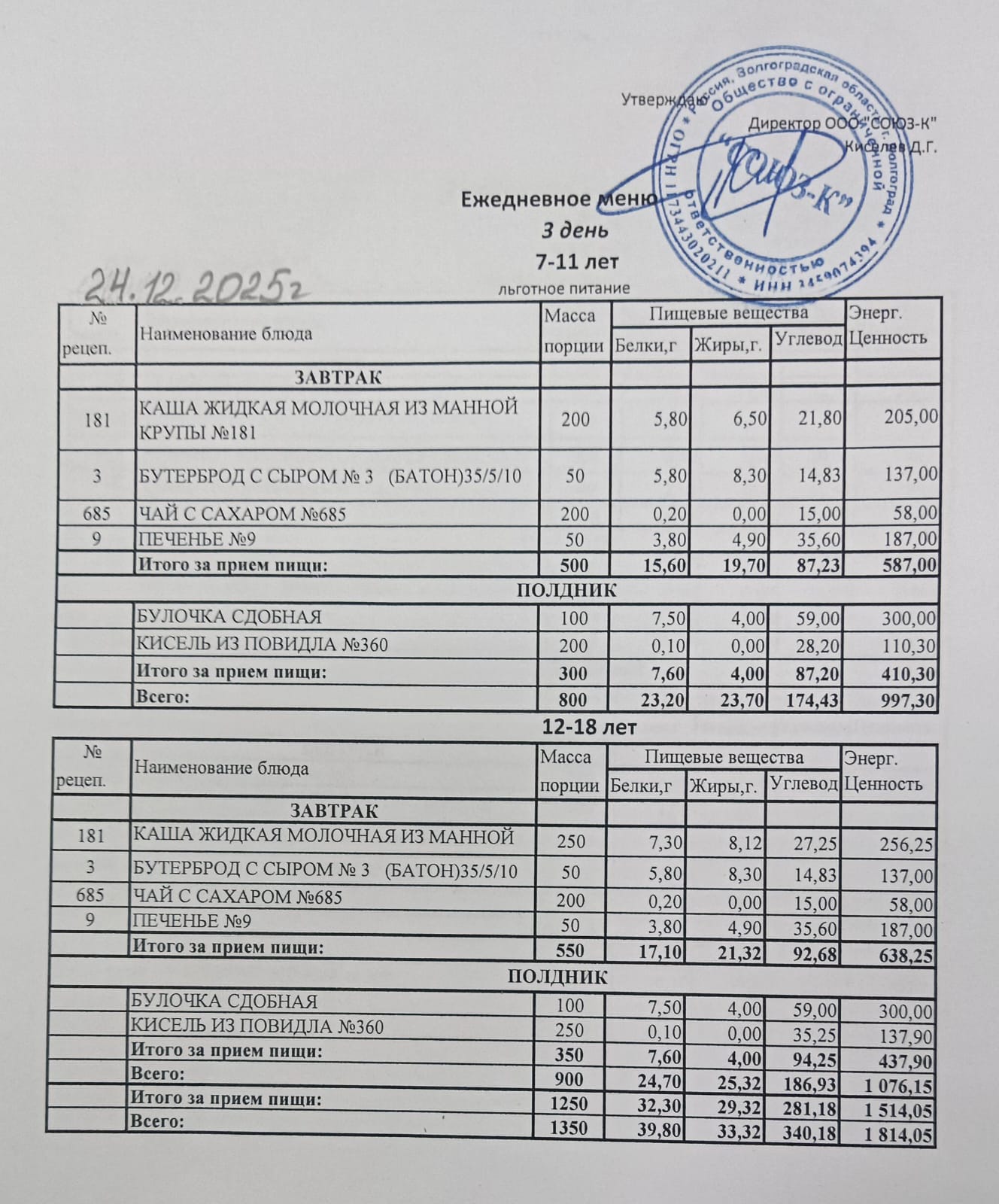 24.12.2025 г. Меню - 3 день - Фото (завтрак) (полдник)