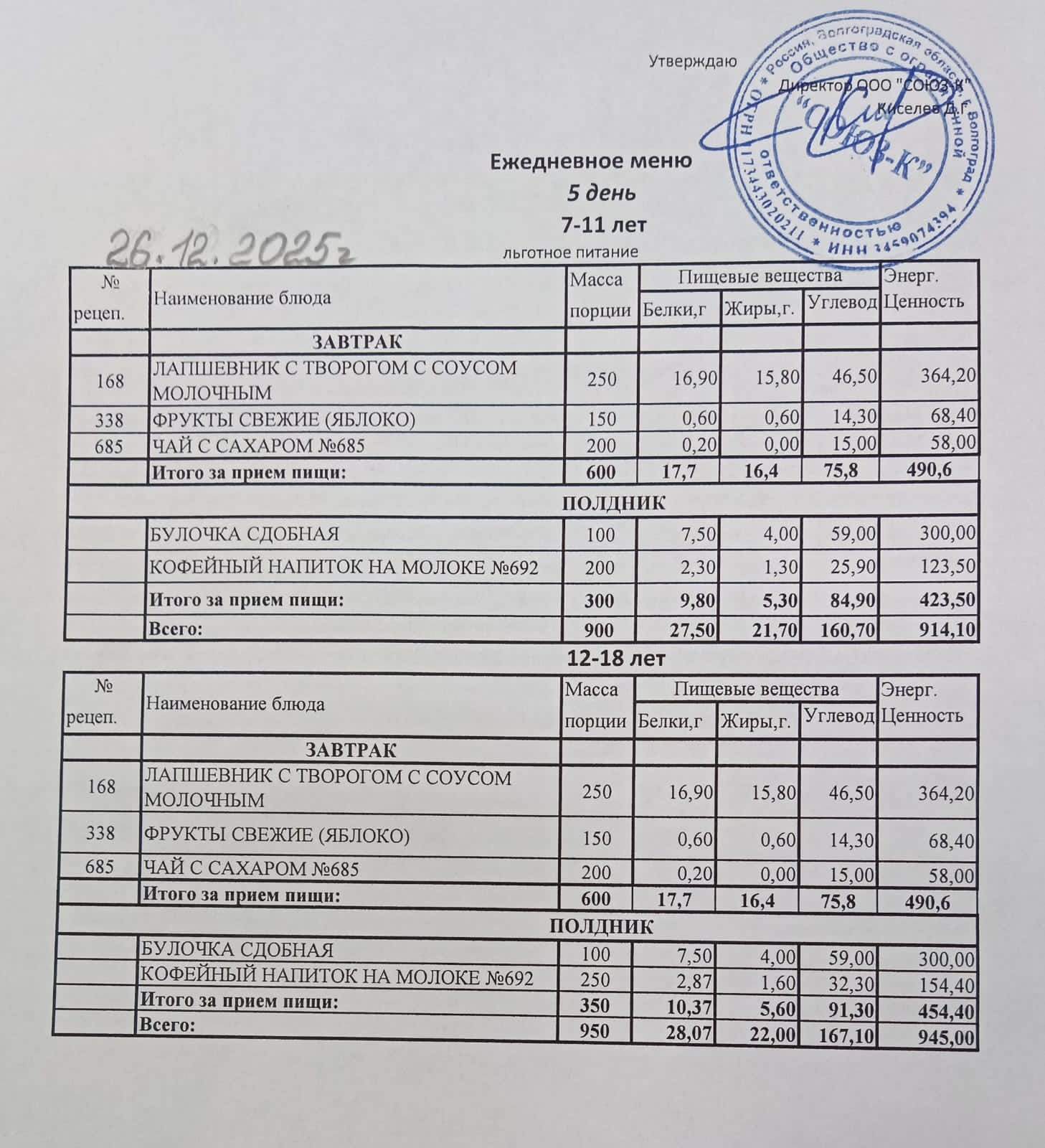26.12.2025 г. Меню - 5 день - Фото (завтрак) (полдник)